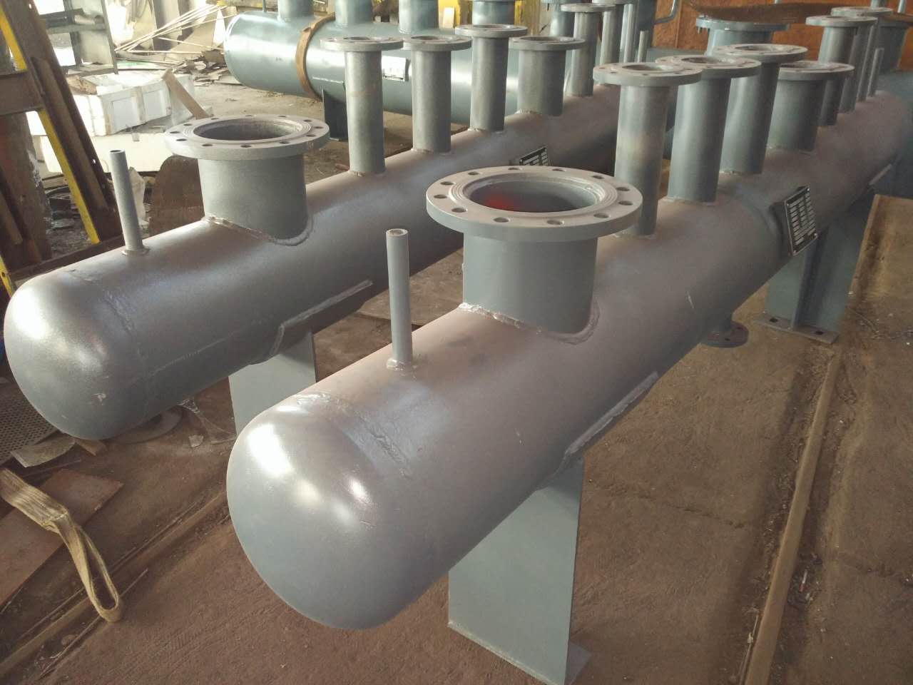 分集汽缸是由分(集)汽缸和集汽缸组合而成的汽流量分配和会集装置。分(集)汽缸是将一路进汽通过一个容器分为几路输出的设备,而集汽缸则是将一路进汽通过一个容器一路输出的设备。其管理若干的支路管道,分别包括回汽支路和供汽支路,其较大-为DN200-DN1200不等,用钢板制作,属于压力容器类-业制造,其需要安装压力表温度计。它一方面将主干管的汽按需要进行流量分配,保了各区域分支环路的流量满足负荷需要,同时还要将各分支回路的汽流汇集,并且输入回汽主干管-,实现循环运行。其回汽再利用,可达到-节能的-果,可以同时满足供热与制冷的需要,其-应用于锅炉、-央空调、工业循环冷却水系统、热水系统。